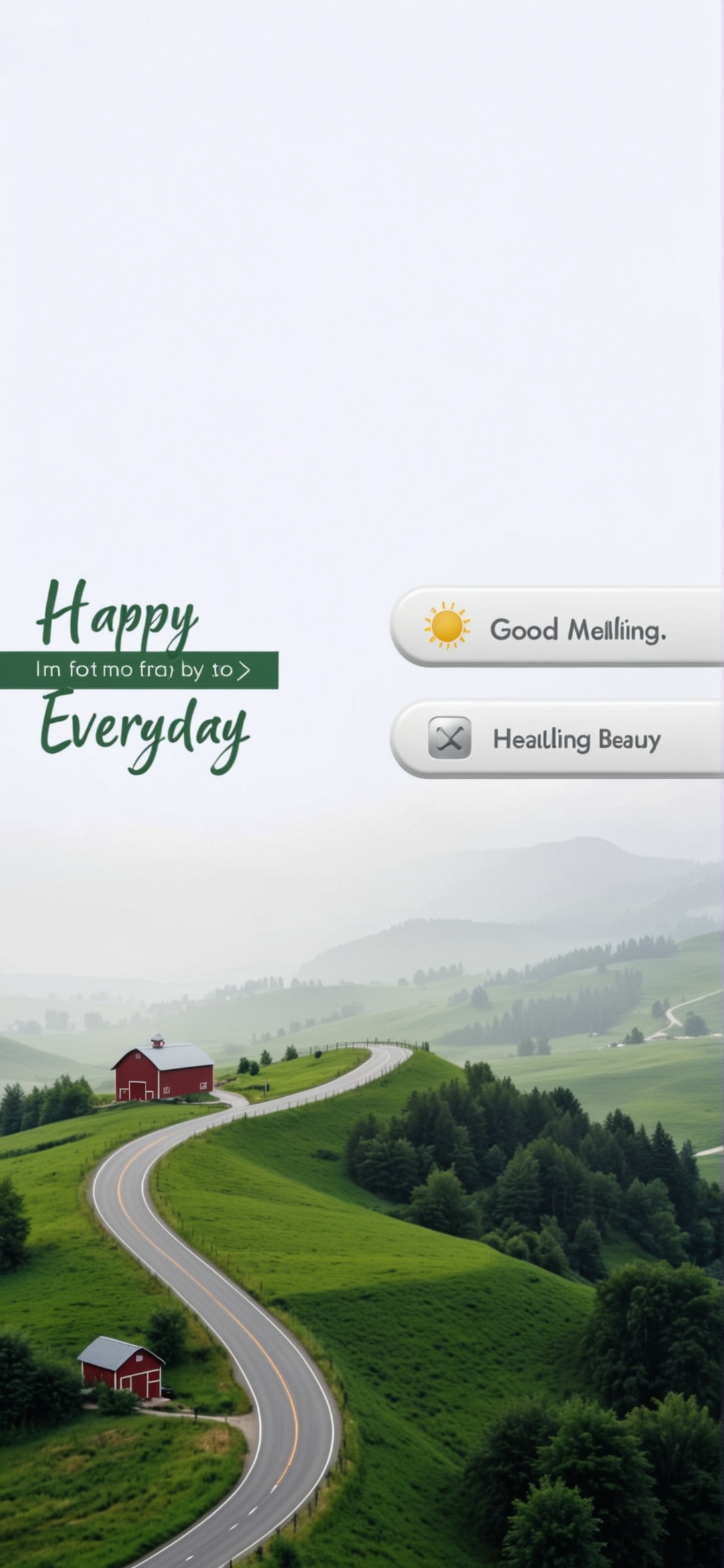 这是一张乡村风景如画的照片。一条弯弯曲曲的柏油路穿过郁郁葱葱的起伏丘陵,通向两个经典的红色谷仓。谷仓有着白色的装饰和简单的设计,坐落在充满活力的绿色景观中。这张照片是从一个很高的有利位置拍摄的,提供了一个广角的场景。色调明亮而欢快,深绿色与红色的谷仓和蓝色的天空形成鲜明的对比。这幅画的整体感觉是一种宁静、祥和和乡村生活之美。覆盖在图像顶部的图形元素写着“Good Mellling”和“Healing Beauty”。